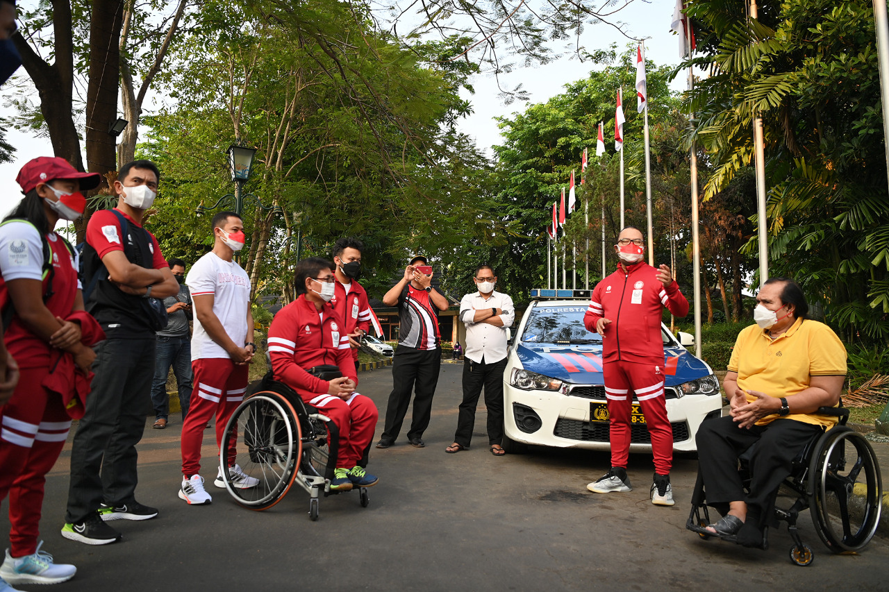 Acara pelepasan keberangkatan rombongan pertama tim Indonesia dilakukan oleh Ketua Umum NPC Indonesia Senny Marbun pada Senin 16 Agustus 2021, pukul 17.30 WIB di halaman Hotel Kusuma Sahid Prince Surakarta, tempat kontingen menjalani karantina.