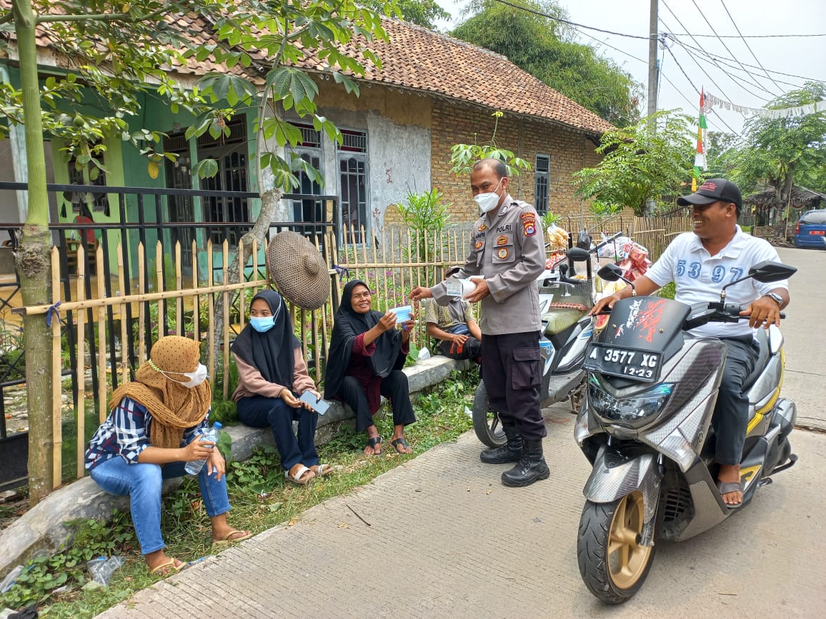 IPOL.ID – Bhabinkamtibmas Polsek Kresek Polresta Tangerang, Bripka Asep Saepul, membagikan masker kepada warga yang sedang antre vaksin di Kantor Desa Koper Kecamatan Kresek Kabupaten Tangerang, Sabtu (2/10).