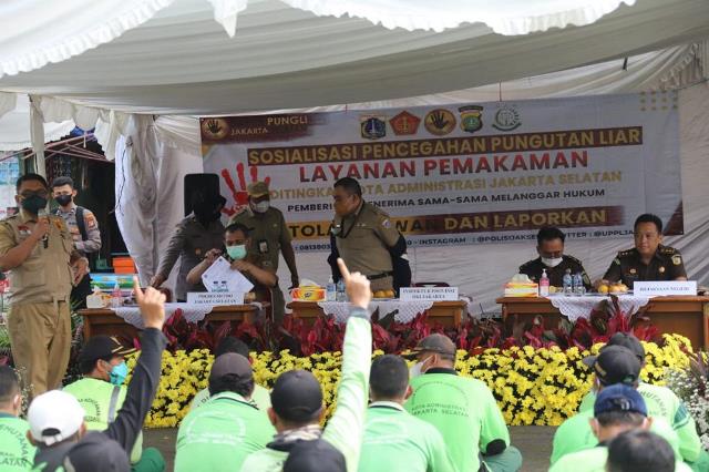 Untuk itu, Inspektur Pembantu Kota Wilayah Jakarta Selatan melalui Tim Unit Pemberantasan Pungutan Liar (UPPL) Kota Administrasi Jakarta Selatan (Jaksel), menggelar sosialisasi pencegahan pungutan liar pada pelayanan masyarakat bidang pemakaman, Selasa (26/7).